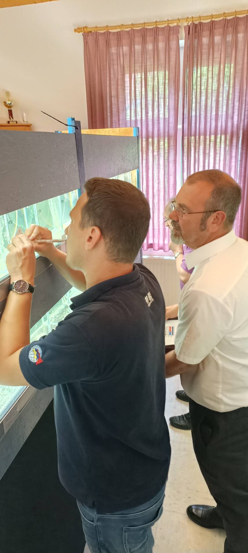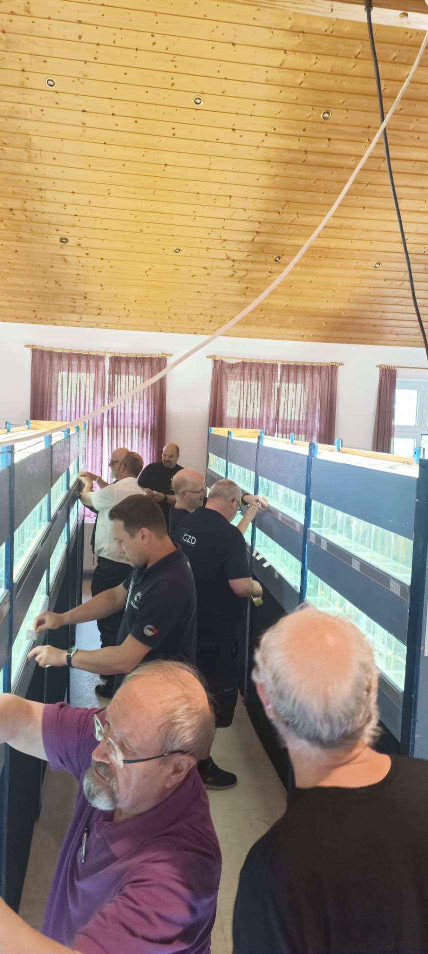 讓魚在星期四休息了一晚恢復狀態後,星期五一大早從9點開始,裁判群們便要對所有的參賽魚隻進行檢查,內容就是校正參賽魚的編碼,或者看魚有沒有問題,例如死亡、嚴重生病或者公母配不起來之類的問題,需要被判失格,無法參與評分。在將所有魚隻後確認完後,便開始進行評分作業。值得一提的是,現在IKGH的評分系統,也是由德國的Tim Hermann所建置,可以完全在線上使用的系統,這讓許多舉辦比賽的俱樂部都輕鬆了不少,且在五位裁判評分後,馬上就能夠雲端計算產出結果,不需要再經過人工計算,非常可靠。